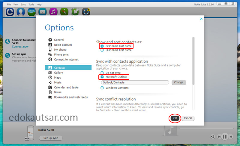 – Pada menu “Sync conflict resolution” kita tentukan jika sudah ada data kontak pada komputer, kita diberikan pilihan untuk membatalkan proses transfer atau menumpuk data yang lama dengan data baru.