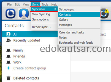 7. Saatnya melakukan sikronisasi, masuk ke menu Sync > Sync now > Contacts. Pada tahap ini kita melakukan proses sinkronisasi kontak ke komputer.