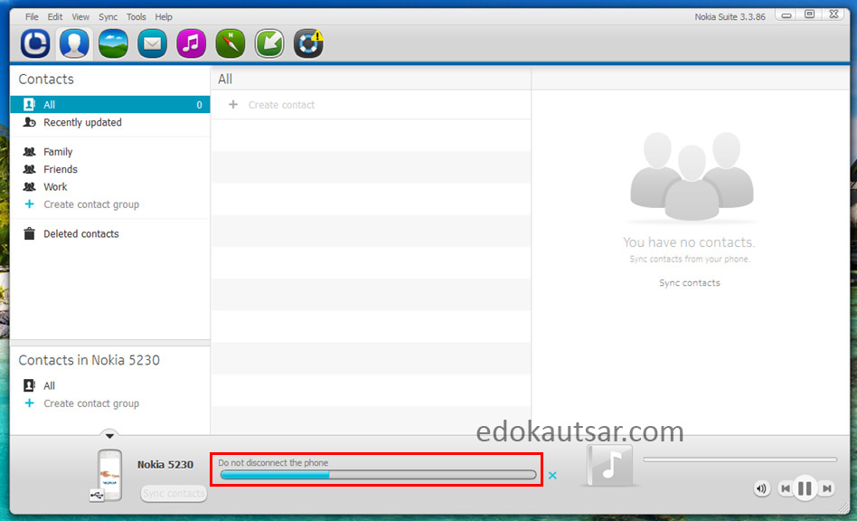 8. Proses transfer ke komputer sedang berlangsung, jangan lepas handphone dari komputer. Status jumlah kontak di Nokia Suite masih 0 (nol).