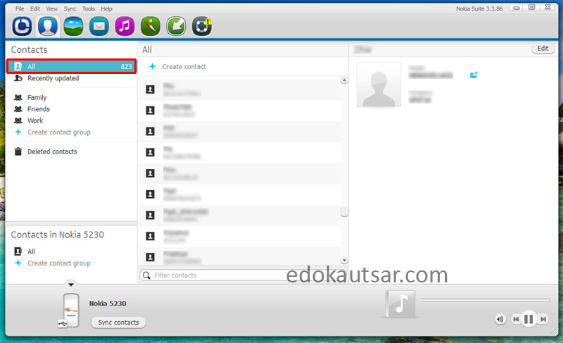 9. Proses telah selesai. Kontak telah masuk ke dalam Nokia Suite seperti pada gambar berikut. Terlihat sudah masuk 823 kontak.